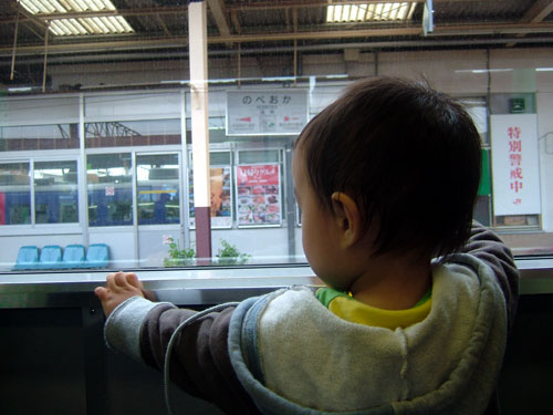 お利口に、乗って居られましたが、電車への食いつきはイマイチのご様子でした。クルマは結構食いつきよくて、自分んちのクルマは目ざとく見つけて、走り寄って行きます。この辺は僕似かな?