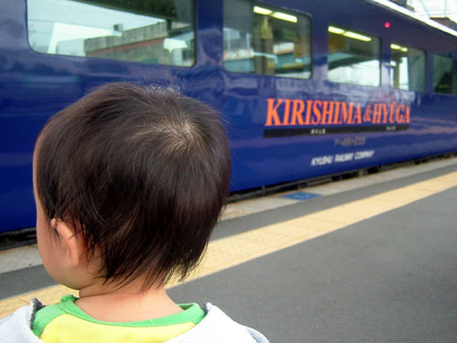 )14:10発、宮崎空港行きの特急へ。ホームへ行く途中も、キョロキョロしながらテクテク歩き、電車が入ってきても別に怖がる様子もなくぼーっと眺めてました。
